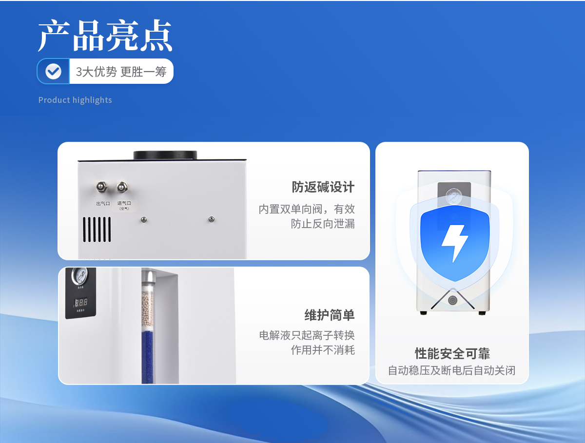 | 1、可取代高壓氮?dú)馄浚箤?shí)驗(yàn)室儀器化。 | 2、操作簡(jiǎn)便,只需啟動(dòng)電源開關(guān),儀器即可產(chǎn)氮且輸出壓力穩(wěn)定。 | 3、不消耗電解液;電解液只起離子轉(zhuǎn)換作用并不消耗,所以只需補(bǔ)充因蒸發(fā)而損失的少量蒸餾水。 | 4、產(chǎn)氣純度高,空氣經(jīng)電解池分離后即可得到高純氮?dú)狻?/td> | 5、性能安全可靠:具有穩(wěn)壓和斷電后自動(dòng)關(guān)閉氣路功能。 | 6、壽命長(zhǎng),既可間斷使用,又可連續(xù)使用且產(chǎn)氣量穩(wěn)定、不衰減。 | 7、**節(jié)能:采用**的開關(guān)電源,提高了電解效率。 | 8、配有雙單向閥,自動(dòng)防返堿。 |