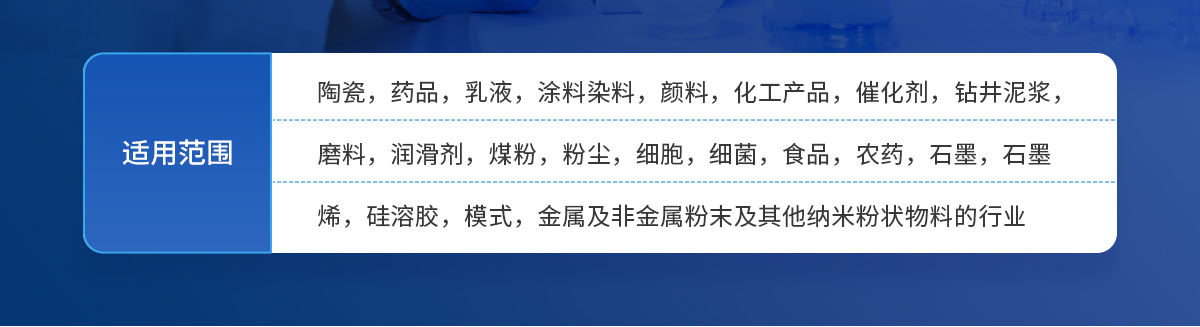 YT-JLGS-2000廣泛應(yīng)用于水泥、陶瓷、藥品、乳液、涂料、染料、顏料、填料、化工產(chǎn)品、催化劑、鉆井泥漿、磨料、潤(rùn)滑劑、煤粉、泥砂、粉塵、細(xì)胞、細(xì)菌、食品、添加劑、農(nóng)藥、炸藥、石墨、感光材料、燃料、墨汁、金屬與非金屬粉末、碳酸鈣、高嶺土、水煤漿及其他粉狀物料。