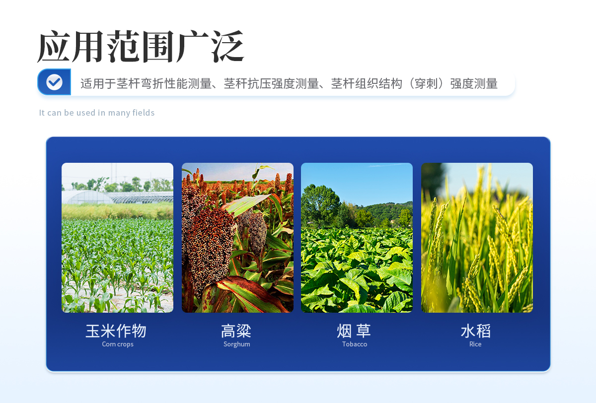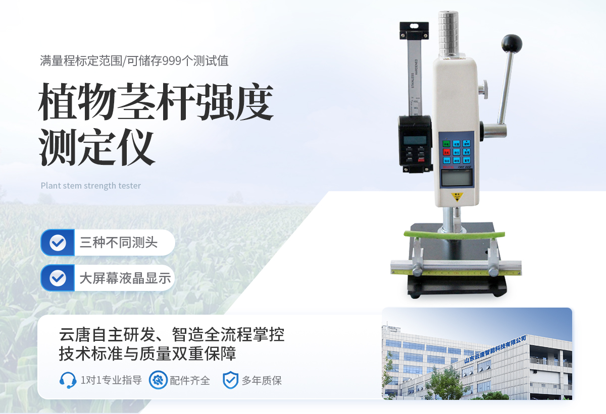植物莖稈的強度是決定作物抗倒伏能力的一個主要因素,長期以來玉米,高梁、煙草等的倒伏給作物的機械收割造成很大的困難。從機械化水平來說,造成大量的糧食浪費。另外,作物倒伏導致光照不充分,使其生產量受到極大的限制。在作物生長的各個階段對其莖稈進行活體測量,進而根據莖桿纖維層的抗彎阻力與抗倒伏能力的相關性對群體測量數據進行統計處理,對作物的栽培和育種具有重要意義。植物莖稈強度儀采用拉壓力傳感器,通過針刺、壓碎、折斷的方式測出莖稈斷裂或者屈服瞬間產生的**力,即莖稈的強度