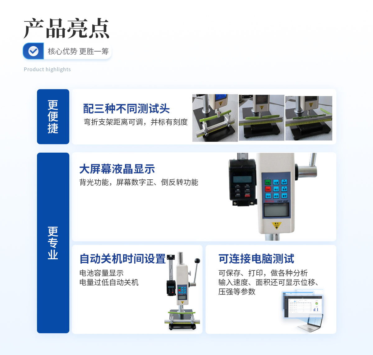| 1、三種不同測頭:可進行莖桿彎折性能測量、莖稈抗壓強度測量、莖桿組織結構(穿刺)強度測量;彎折支架距離可調,并標有刻度。 | 2、可配測位移標尺 | 3、可連接電腦測試,可保存、打印,做各種分析,輸入速度、面積還可顯示位移、壓強等參數; | 4、可儲存999個測試值; | 5、大屏幕液晶顯示,有背光功能,并具有屏幕數字正、倒反轉功能; | 6、自動關機時間設置; | 7、電池容量顯示,電量過低自動關機。 |