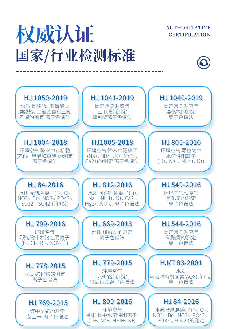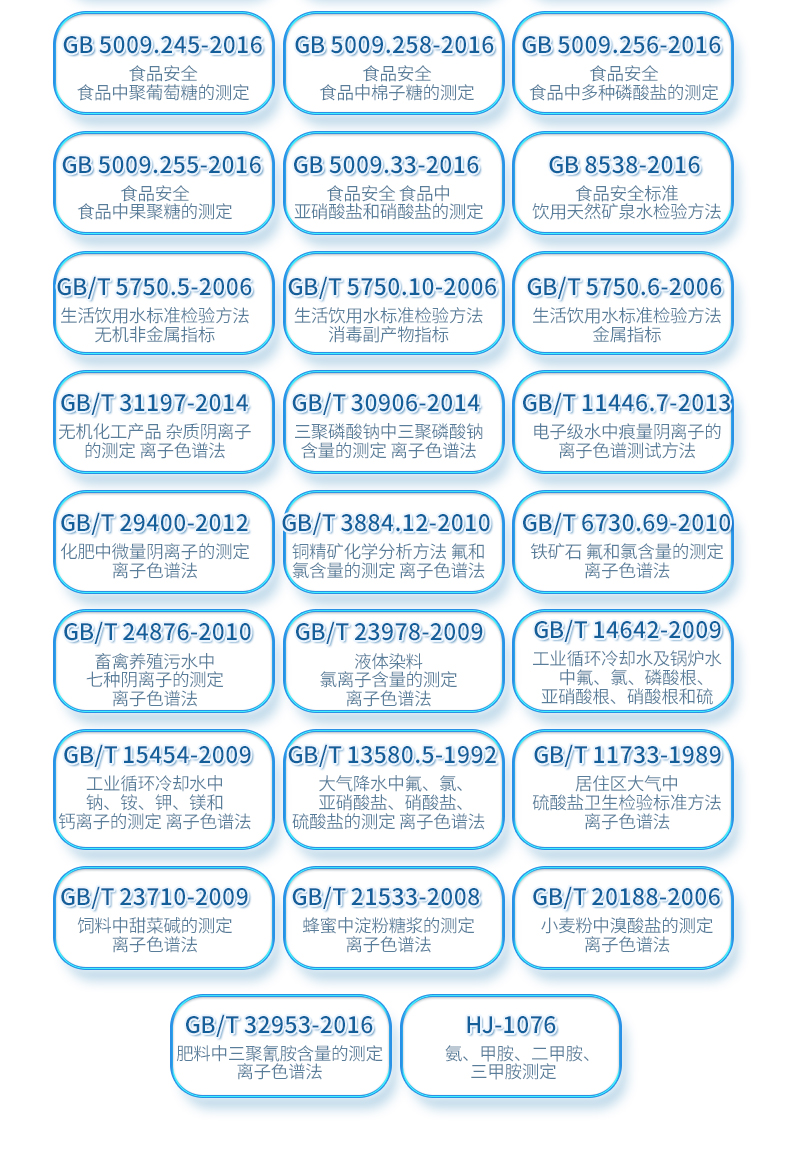 | HJ 1050-2019 水質(zhì) 氯酸鹽、亞氯酸鹽、溴酸鹽、二氯乙酸和三氯乙酸的測定 離子色譜法 | HJ 1041-2019 固定污染源廢氣 三甲胺的測定 抑制型離子色譜法 | HJ 1040-2019 固定污染源廢氣 溴化氫的測定 離子色譜法 | HJ 1004-2018 環(huán)境空氣 降水中有機酸(乙酸、甲酸和草酸)的測定 離子色譜法 | HJ1005-2018 環(huán)境空氣 降水中陽離子(Na+、NH4+、K+、Mg2+、Ca2+)的測定 離子色譜法 | HJ 800-2016 環(huán)境空氣 顆粒物中水溶性陽離子(Li+、Na+、NH4+、K+) | HJ 84-2016 水質(zhì) 無機陰離子(F-、Cl-、NO2-、Br-、NO3-、PO43-、SO32-、SO42-)的測定 | HJ 812-2016 水質(zhì) 可溶性陽離子(Li+、Na+、NH4+、K+、Ca2+、Mg2+)的測定 離子色譜法 | HJ 549-2016 環(huán)境空氣和廢氣 氯化氫的測定 離子色譜法 | HJ 799-2016 環(huán)境空氣 顆粒物中水溶性陰離子(F-、Cl-、Br-、NO2-等) | HJ 669-2013 水質(zhì) 磷酸鹽的測定 離子色譜法 | HJ 544-2016 固定污染源廢氣 硫酸霧的測定 離子色譜法 | HJ 778-2015 水質(zhì) 碘化物的測定 離子色譜法 | HJ 779-2015 環(huán)境空氣 六價鉻的測定 柱后衍生離子色譜法 | HJ/T 83-2001 水質(zhì) 可吸附有機鹵素(AOX)的測定 離子色譜法 | HJ 769-2015 煤中全硫的測定 艾士卡-離子色譜法 | HJ 800-2016 環(huán)境空氣 顆粒物中水溶性陽離子(Li+、Na+、NH4+、K+) | HJ 84-2016 水質(zhì) 無機陰離子(F-、Cl-、NO2-、Br-、NO3-、PO43-、SO32-、SO42-)的測定 | GB 5009.245-2016 食品安全 食品中聚葡萄糖的測定 | GB 5009.258-2016 食品安全 食品中棉子糖的測定 | GB 5009.256-2016 食品安全 食品中多種磷酸鹽的測定 | GB 5009.255-2016 食品安全 食品中果聚糖的測定 | GB 5009.33-2016 食品安全 食品中亞硝酸鹽和硝酸鹽的測定 | GB 8538-2016 食品安全標(biāo)準(zhǔn) 飲用天然礦泉水檢驗方法 | GB/T 5750.5-2006 生活飲用水標(biāo)準(zhǔn)檢驗方法 無機非金屬指標(biāo) | GB/T 5750.10-2006 生活飲用水標(biāo)準(zhǔn)檢驗方法 消毒副產(chǎn)物指標(biāo) | GB/T 5750.6-2006 生活飲用水標(biāo)準(zhǔn)檢驗方法 金屬指標(biāo) | GB/T 31197-2014 無機化工產(chǎn)品 雜質(zhì)陰離子的測定 離子色譜法 | GB/T 30906-2014 三聚磷酸鈉中三聚磷酸鈉含量的測定 離子色譜法 | GB/T 11446.7-2013 電子級水中痕量陰離子的離子色譜測試方法 | GB/T 29400-2012 化肥中微量陰離子的測定 離子色譜法 | GB/T 3884.12-2010 銅精礦化學(xué)分析方法 第12部分:氟和氯含量的測定 離子色譜法 | GB/T 6730.69-2010 鐵礦石 氟和氯含量的測定 離子色譜法 | GB/T 24876-2010 畜禽養(yǎng)殖污水中七種陰離子的測定 離子色譜法 | GB/T 23978-2009 液體染料 氯離子含量的測定 離子色譜法 | GB/T 14642-2009 工業(yè)循環(huán)冷卻水及鍋爐水中氟、氯、磷酸根、亞硝酸根、硝酸根和硫 | GB/T 15454-2009 工業(yè)循環(huán)冷卻水中鈉、銨、鉀、鎂和鈣離子的測定 離子色譜法 | GB/T 23710-2009 飼料中甜菜堿的測定 離子色譜法 | GB/T 21533-2008 蜂蜜中淀粉糖漿的測定 離子色譜法 | GB/T 20188-2006 小麥粉中溴酸鹽的測定 離子色譜法 | GB/T 13580.5-1992 大氣降水中氟、氯、亞硝酸鹽、硝酸鹽、硫酸鹽的測定 離子色譜法 | GB/T 32953-2016 肥料中三聚氰胺含量的測定 離子色譜法 | GB/T 11733-1989 居住區(qū)大氣中硫酸鹽衛(wèi)生檢驗標(biāo)準(zhǔn)方法 離子色譜法 | HJ-1076 氨、甲胺、二甲胺、三甲胺測定 |
