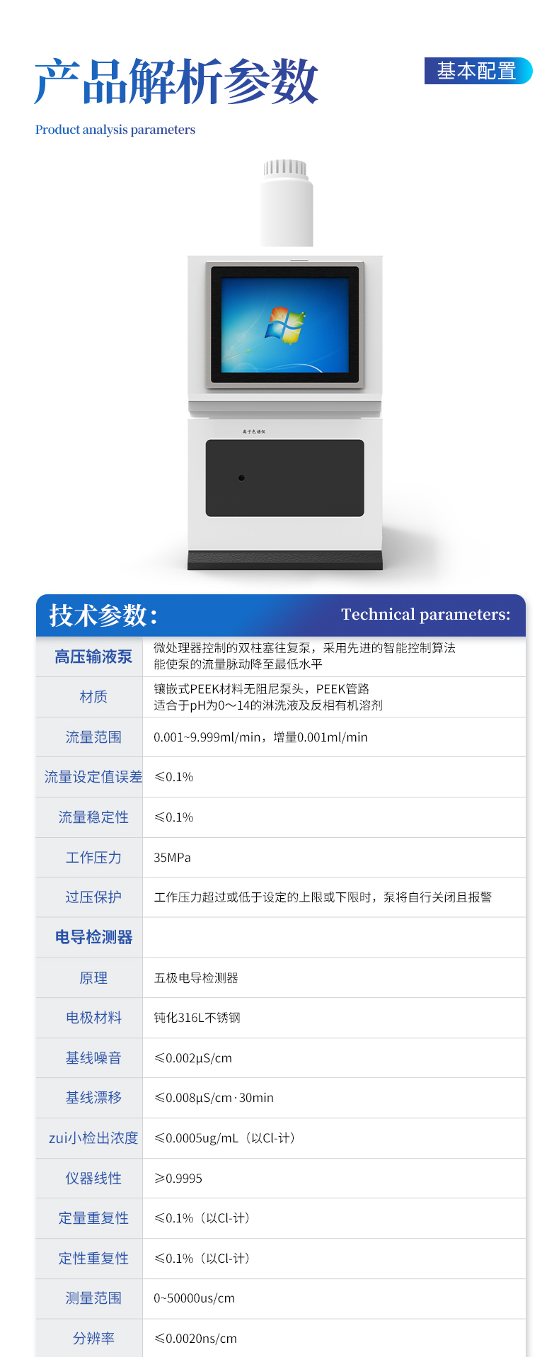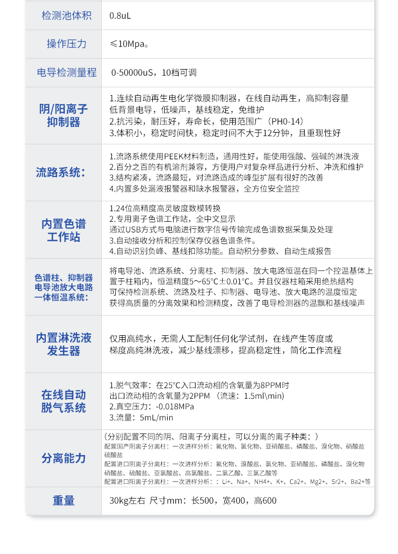 微處理器控制的雙柱塞往復(fù)泵,采用**的智能控制算法,能使泵的流量脈動降至**水平。 1.1,材質(zhì):鑲嵌式PEEK材料無阻尼泵頭,PEEK管路,適合于pH為0~14的淋洗液及反相有機溶劑。 1.2,流量范圍:0.001~9.999ml/min,增量0.001ml/min。 1.3,流量設(shè)定值誤差:≤0.1% 1.4,流量穩(wěn)定性:≤0.1% 1.5,工作壓力:35MPa 1.6,過壓保護:工作壓力超過或低于設(shè)定的上限或下限時,泵將自行關(guān)閉且報警。 | 2 電導(dǎo)檢測器: 2.1,原理:五極電導(dǎo)檢測器 2.2,電極材料:鈍化316L不銹鋼 2.3,基線噪音:≤0.002μS/cm 2.4,基線漂移:≤0.008μS/cm·30min 2.5,zui小檢出濃度:≤0.0005ug/mL(以Cl-計) 2.6,儀器線性:≥0.9995 2.7,定量重復(fù)性:≤0.1%(以Cl-計) 2.8,定性重復(fù)性:≤0.1%(以Cl-計) 2.9,測量范圍:0~50000us/cm 2.10,分辨率:≤0.0020ns/cm 2.11,檢測池體積:0.8uL 2.12,操作壓力:≤10Mpa。 2.13,電導(dǎo)檢測量程: 0-50000uS,10檔可調(diào)。 | 3、 陰、陽離子抑制器: 3.1連續(xù)自動再生電化學(xué)微膜抑制器,在線自動再生,高抑制容量,低背景電導(dǎo),低噪聲,基線穩(wěn)定,免維護。 3.2抗污染,耐壓好,壽命長,使用范圍廣(PH0-14)。 3.3體積小,穩(wěn)定時間快,穩(wěn)定時間不大于12分鐘,且重現(xiàn)性好。 | 4 流路系統(tǒng): 4.1流路系統(tǒng)使用PEEK材料制造,通用性好,能使用強酸、強堿的淋洗液。 4.2百分之百的有機溶劑兼容,方便用戶對復(fù)雜樣品進行分析、沖洗和維護。 4.3 結(jié)構(gòu)緊湊,流路*短,對流路造成的峰型擴展有很好的改善。 4.4 內(nèi)置多處漏液報警器和缺水報警器,全方位安全監(jiān)控。 | 5 內(nèi)置色譜工作站: 5.1 24位高精度高靈敏度數(shù)模轉(zhuǎn)換。 5.2專用離子色譜工作站,全中文顯示,通過USB方式與電腦進行數(shù)字信號傳輸,完成色譜數(shù)據(jù)采集及處理。 5.3自動接收分析和控制保存儀器色譜條件。 5.4自動識別負(fù)峰、基線扣除功能。自動積分參數(shù)、自動生成報告。 | 6 色譜柱、抑制器、電導(dǎo)池、放大電路一體恒溫系統(tǒng): 將電導(dǎo)池、流路系統(tǒng)、分離柱、抑制器、放大電路恒溫在同一個控溫基體上置于柱箱內(nèi),恒溫精度5~65℃±0.01℃。并且儀器柱箱采用絕熱結(jié)構(gòu),可保持檢測系統(tǒng)、流路及柱子、抑制器、電導(dǎo)池、放大電路的溫度恒定,獲得高質(zhì)量的分離效果和檢測精度,改善了電導(dǎo)檢測器的溫飄和基線噪聲。 | 7內(nèi)置淋洗液發(fā)生器,僅用高純水,無需人工配制任何化學(xué)試劑,在線產(chǎn)生等度或梯度高純淋洗液,減少基線漂移,提高穩(wěn)定性,簡化工作流程。 | 8 在線自動脫氣系統(tǒng): 1,脫氣效率:在25℃入口流動相的含氧量為8PPM時,出口流動相的含氧量為2PPM (流速:1.5ml\min) 2,真空壓力:-0.018MPa 3,流量:5mL/min | 9 分離能力:(分別配置不同的陰、陽離子分離柱,可以分離的離子種類:) 配置國產(chǎn)陰離子分離柱:一次進樣分析:氟化物、氯化物、亞硝酸鹽、磷酸鹽、溴化物、硝酸鹽、硫酸鹽 配置進口陰離子分離柱:一次進樣分析:氟化物、溴酸鹽、氯化物、亞硝酸鹽、磷酸鹽、溴化物、硝酸鹽、硫酸鹽、亞氯酸鹽、高氯酸鹽、二氯乙酸、三氯乙酸等 配置進口陽離子分離柱:一次進樣分析::Li+、Na+、NH4+、K+、Ca2+、Mg2+、Sr2+、Ba2+等 | 10 重量:30kg左右 尺寸mm:長500,寬400,高600 |