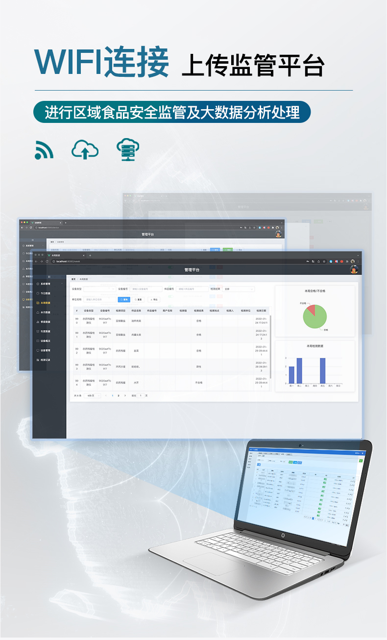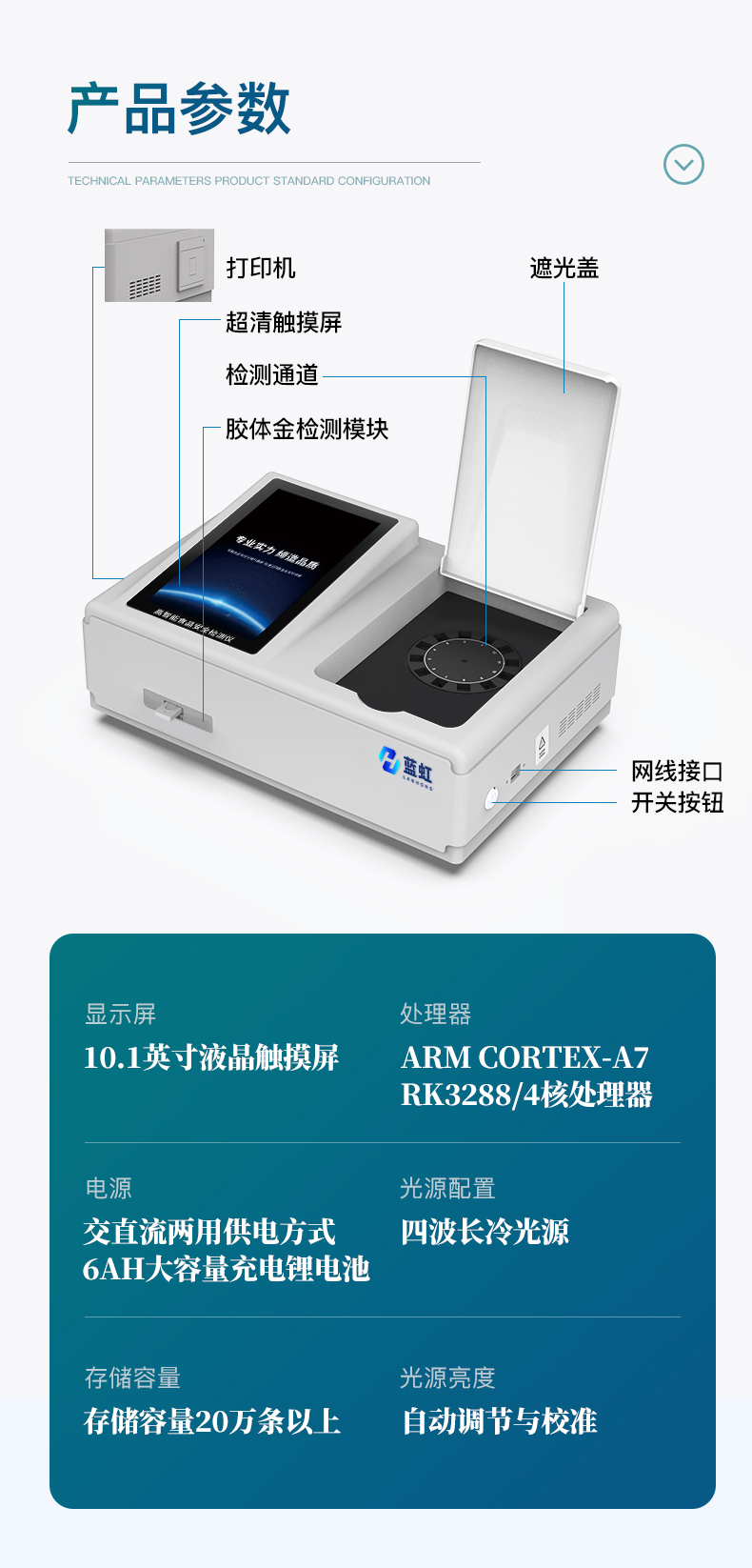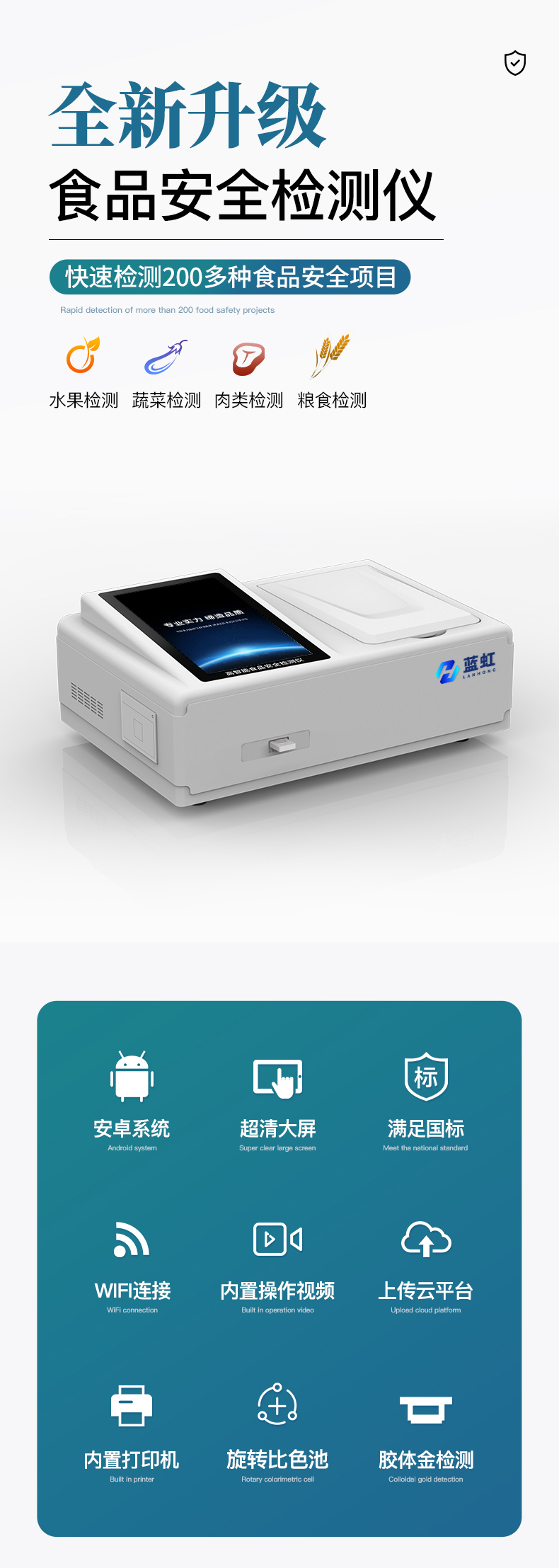 | 儀器采用手提式一體化系統(tǒng)檢測技術(shù),將分光光度模塊、數(shù)字化管理模塊、無線通訊模塊高度集成于一體,支持檢測200種食品安全檢測項目,同時預(yù)留升級檢測方法。 | 儀器檢測模塊標(biāo)準(zhǔn)化、智能化,檢測項目可隨意自由組合。檢測箱體內(nèi)置多個標(biāo)準(zhǔn)檢測單元,檢測模塊可以調(diào)整配置。 | 顯示屏幕:儀器采用10.1英寸豎向液晶觸摸屏顯,搭配運(yùn)行安卓智能操作系統(tǒng),主控芯片采用ARM Cortex-A7,RK3288/4核處理器,主頻1.88Ghz,操作方便,性能更強(qiáng)。 | 檢測通道:≥12通道;采用精密旋轉(zhuǎn)比色池設(shè)計,使用同芯片同光源校準(zhǔn)精度,解決不同光源之間的誤差值,更加準(zhǔn)確**。(1-12通道間誤差0.1%,***:**202022821055.2) | 儀器光源:高精度進(jìn)口四波長冷光源,每個通道均配置 410、520、590、630nm 波長光源,標(biāo)配**的光路切換裝置,專利光路切換功能可實現(xiàn)64波長,并且所有檢測項目可實現(xiàn)所有通道同時檢測。 | 設(shè)備可一鍵校準(zhǔn),自動保存校準(zhǔn)數(shù)據(jù),自動對比校驗,得到精準(zhǔn)光源,采用Android SP存儲數(shù)據(jù),光源數(shù)據(jù)永不丟失,方便每一次使用。 | 通訊接口:配備無線通信模塊、可選配4G(APN)通訊模塊和藍(lán)牙傳輸,同時具有雙USB接口以及RJ45網(wǎng)線接口,可以多方式實現(xiàn)數(shù)據(jù)保存及數(shù)據(jù)傳輸。 | 存儲方式:支持U盤存儲,標(biāo)準(zhǔn)USB接口,免驅(qū)動安裝。檢測結(jié)果存儲容量20萬條以上,可生成Excel表格進(jìn)行拷貝,并具有登錄保護(hù)功能。 | 智能化操作系統(tǒng): | 1)操作系統(tǒng):儀器可在同一檢測界面自動對應(yīng)相關(guān)檢測通道,一次性選擇1-12個樣品名稱,無需退出界面,節(jié)省操作時間。并可以對每個通道屬性和樣品信息單獨(dú)進(jìn)行編輯,例如送檢單位、人員,檢測人員等,打印時勾選打印顯示。 | 2)數(shù)據(jù)集成系統(tǒng):設(shè)備首頁自動匯總分析檢測數(shù)據(jù),包含:周檢測數(shù)據(jù)、月檢測數(shù)據(jù),全部檢測總數(shù)量,均包含檢測總數(shù),合格數(shù),不合格數(shù),以及相關(guān)柱形分析圖,各項檢測數(shù)據(jù)一目了然,無需電腦查詢,更加快捷直觀。 | 3)數(shù)據(jù)庫系統(tǒng):十幾項數(shù)據(jù)庫分類管理儀器:包含項目類型、項目數(shù)據(jù)、檢測數(shù)據(jù)、歷史記錄、國標(biāo)信息、曲線信息、采樣信息、檢測信息、受檢信息、復(fù)核信息、圖表信息、光源校準(zhǔn)信息、打印樣式信息、樣品庫信息等等,數(shù)據(jù)庫之間互相協(xié)調(diào)聯(lián)動保證數(shù)據(jù)的真實完整性。同時產(chǎn)品數(shù)據(jù)庫以及歷史檢測記錄支持一鍵檢索功能。 | 4)限量規(guī)判系統(tǒng):具有限量查詢、添加物質(zhì)合規(guī)判定系統(tǒng)。檢測出結(jié)果后,系統(tǒng)自動調(diào)用系統(tǒng)數(shù)據(jù)庫中相關(guān)國標(biāo)進(jìn)行比對判定,客觀顯示判定結(jié)果是否合格。 | 5)項目預(yù)設(shè)系統(tǒng):儀器具有任務(wù)預(yù)設(shè)模塊,一鍵提前預(yù)設(shè),給出方便快捷的新檢測方案,每一個任務(wù)分別可以設(shè)置不同的樣品、批次、編號、來源、備注、抽樣信息、檢測信息、受檢信息、復(fù)核信息等更多信息。樣品送檢時一鍵調(diào)取保存信息,并可多次調(diào)取,大大提高檢測效率。 | 6)數(shù)據(jù)監(jiān)管系統(tǒng):同步對接監(jiān)管平臺,數(shù)據(jù)可局域網(wǎng)和互聯(lián)網(wǎng)數(shù)據(jù)上傳,檢測結(jié)果可選擇直接傳至食品安全監(jiān)管平臺。進(jìn)行區(qū)域食品安全監(jiān)管及大數(shù)據(jù)分析處理與數(shù)據(jù)統(tǒng)計,檢測區(qū)域食品安全長短期動態(tài),達(dá)到食品安全問題預(yù)估、預(yù)警。 | 7)打印系統(tǒng):內(nèi)置全新打印機(jī),新創(chuàng)自定義打印方式,可按需靈活勾選控制:產(chǎn)品合格證(國家農(nóng)業(yè)部標(biāo)準(zhǔn)要求),二維碼,抽樣信息、檢測信息,受檢信息、復(fù)核信息、抽樣日期、檢測日期等信息的打印。 | 供電模式:儀器交直流兩用,直流12V供電,可連接車載電源,可配6ah大容量充電鋰電池,電量可實時顯示,方便戶外流動測試。 | 儀器加入遠(yuǎn)程升級功能,可定向分客戶分儀器更新,開機(jī)后自動更新,客戶無需任何操作,即可升級全新項目。做到了無需退換機(jī)器即可實現(xiàn)實時遠(yuǎn)程升級檢測儀器。 | 設(shè)備尺寸:(長*寬*高)440*300*180mm | 儀器加入遠(yuǎn)程升級功能,可定向分客戶分儀器更新,開機(jī)后自動更新,客戶無需任何操作,即可升級全新項目。做到了無需退換機(jī)器即可實現(xiàn)實時遠(yuǎn)程升級檢測儀器。 |