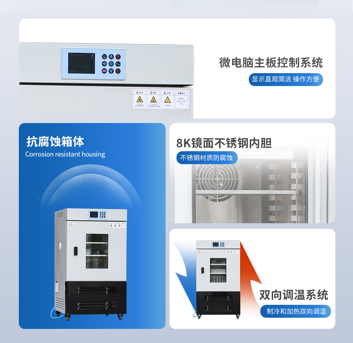 | 工作容積:1000L | 箱內照明:日光燈 | 控溫范圍:0-70℃(設定溫度≤10℃時環境溫度要低于30℃) | 程序控制:24段 | 溫度分辨率:0.1℃ | 溫度波動度:±0.5℃ | 控濕范圍:30%-95% | 定時范圍:0-99小時59分鐘 | 加熱功率:1200W | 內箱尺寸 寬*深*高(cm):100*100*100 | 外箱尺寸 寬*深*高(cm):114*130*170 | 隔板層數(標配):3層 | 層間隔/mm:80 | 卡槽層數:8 | 加濕器容量(標配):16L | 單層隔板承重:<30kg | 底部總承重:100kg | 電壓:AC220V 50HZ | 整機重量:202kg | 內膽材質:不銹鋼材質 | 箱體材質:冷軋鋼板表面采用抗腐蝕高溫噴塑工藝 |