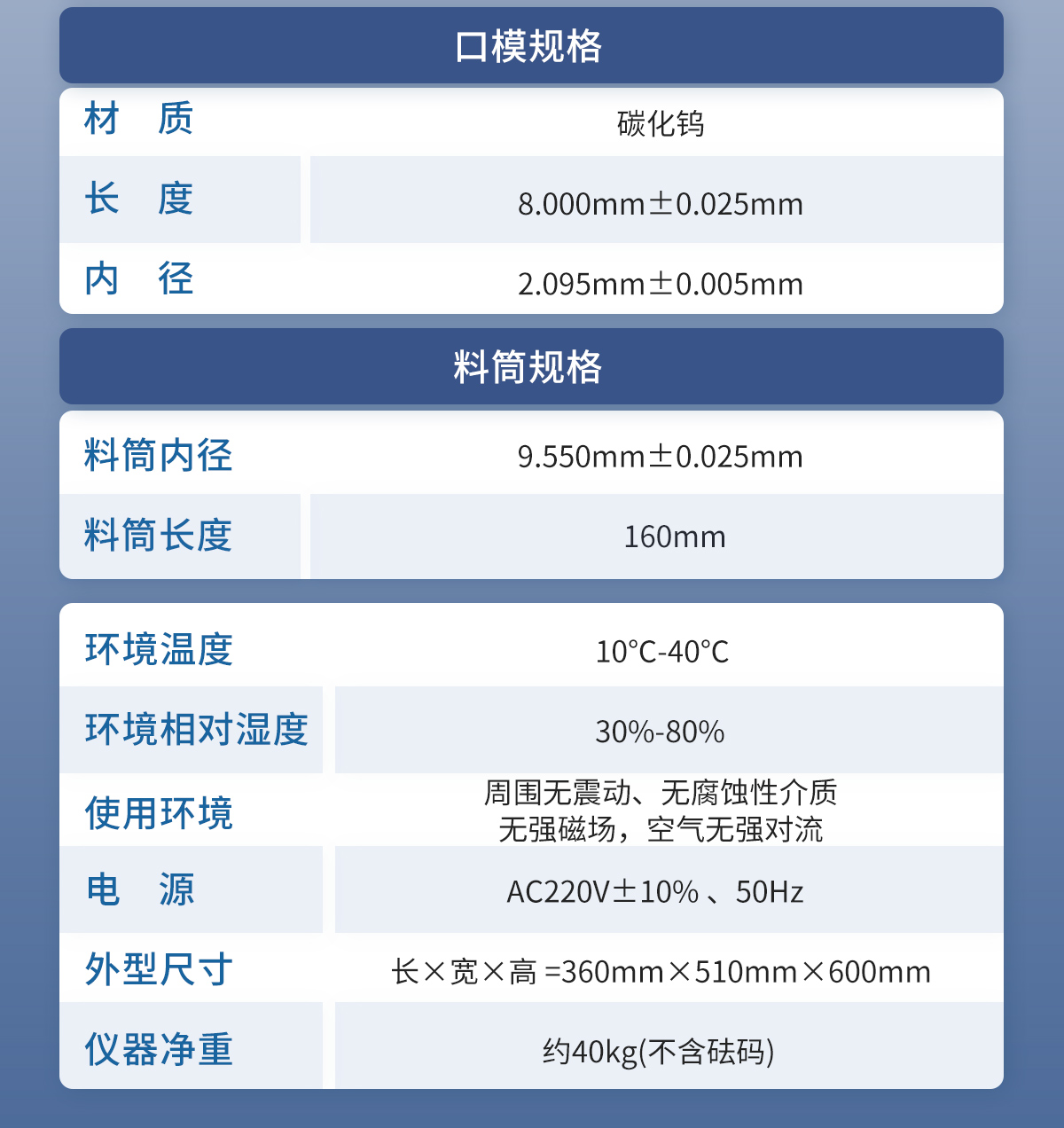 附件:工具箱一個,紗布一卷,口模一個,壓料桿(清潔桿)一支、口模通孔器一支.漏斗一個.夾子一把.砝碼一套.