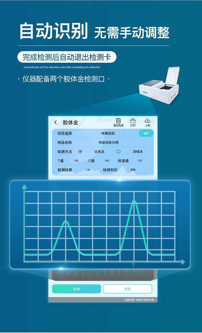 11.5、曲線形式:直插式掃描方式,顯示金標卡圖像,實時生成、識別CT曲線圖,無需手動調整,完成檢測后自動退出檢測卡。兼容市場上其他金標卡,使用耗材不受限制。