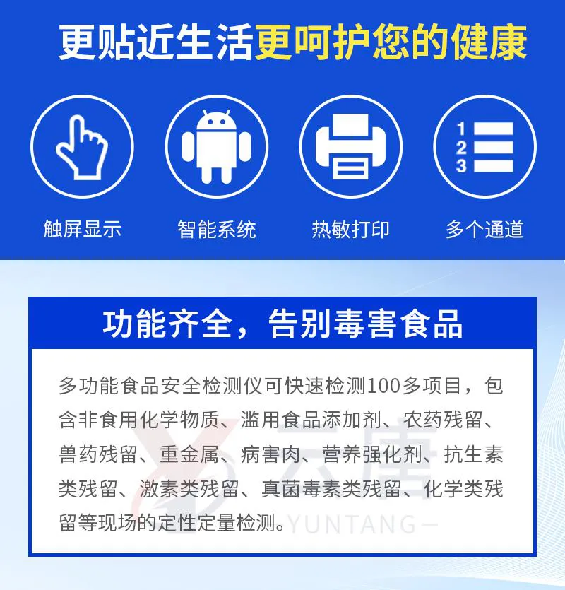 可快速檢測各類食品中的甲醛、二氧化硫、亞硝酸鹽的含量,儀器預留其他項目檢測程序和端口,根據日后需求可方便的自主增加檢測項目。