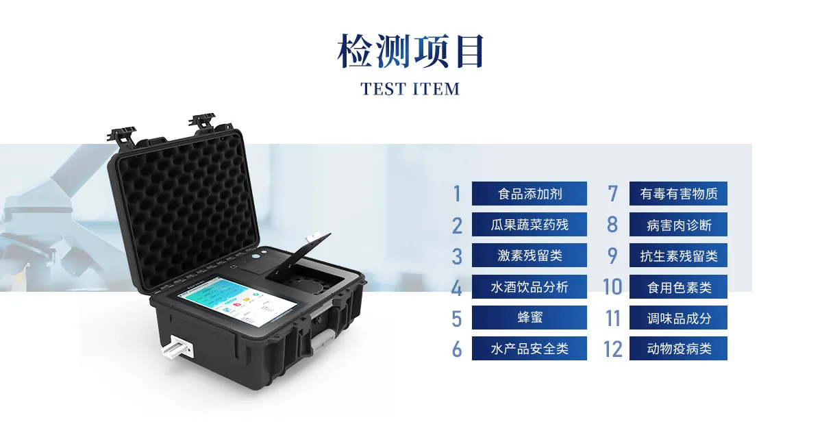 多功能食品安全檢測儀可快速檢測200多項目,包含非食用化學物質、濫用食品添加劑、農藥殘留、獸藥殘留、重金屬、病害肉、營養強化劑、抗生素類殘留、激素類殘留、真菌毒素類殘留、化學類殘留等現場的定性定量檢測。