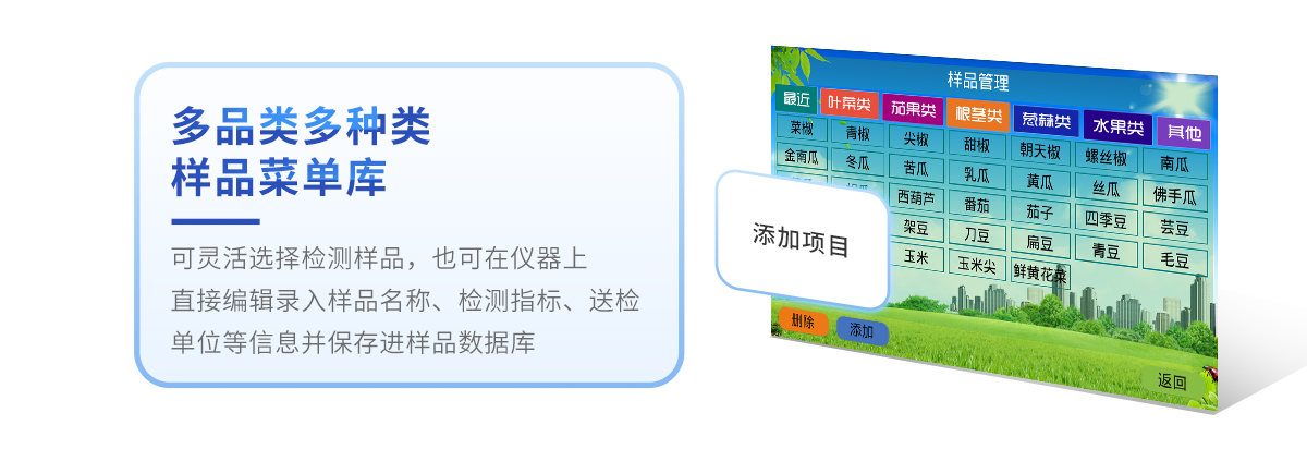 10、儀器具有多品類多種類樣品菜單庫,可靈活選擇檢測(cè)樣品,不同的檢測(cè)通道可同時(shí)檢測(cè)不同的樣品項(xiàng)目。也可在儀器上直接編輯錄入樣品名稱、檢測(cè)指標(biāo)、送檢單位等信息并保存進(jìn)樣品數(shù)據(jù)庫。