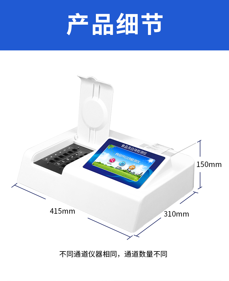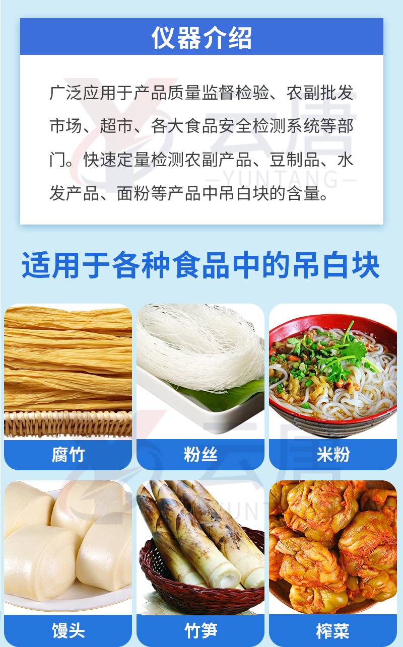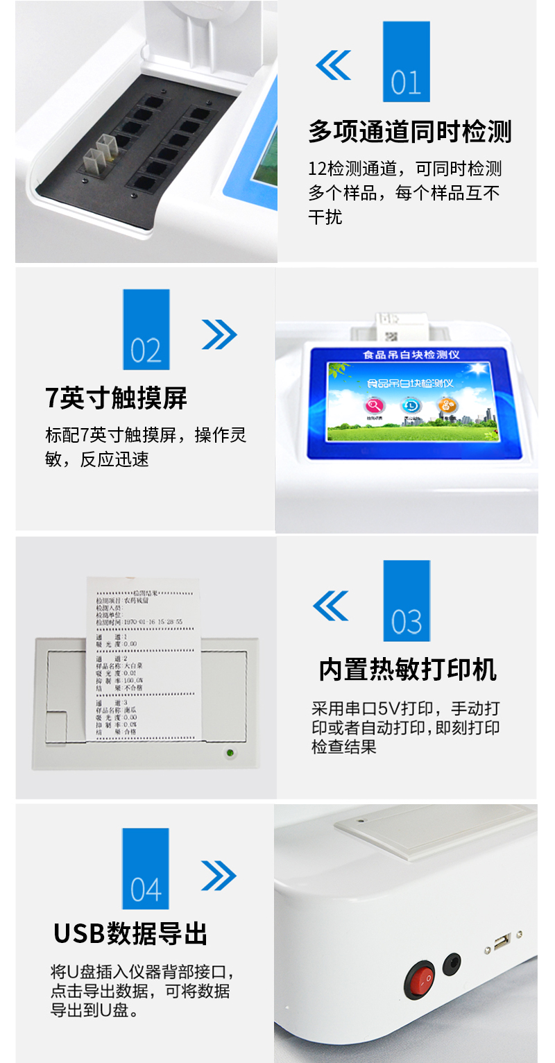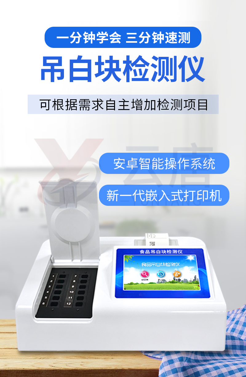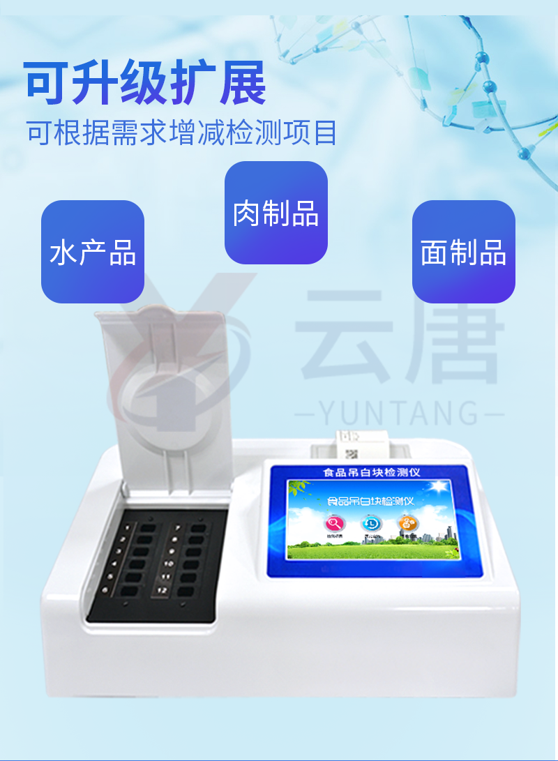 1、 檢測項目:用于快速檢測食品中吊白塊,儀器預(yù)留其他項目檢測程序和端口,根據(jù)日后需求可方便的自主增加檢測項目。日后可升級為檢測,水產(chǎn)品,肉制品,面制品的綜合類型儀器。