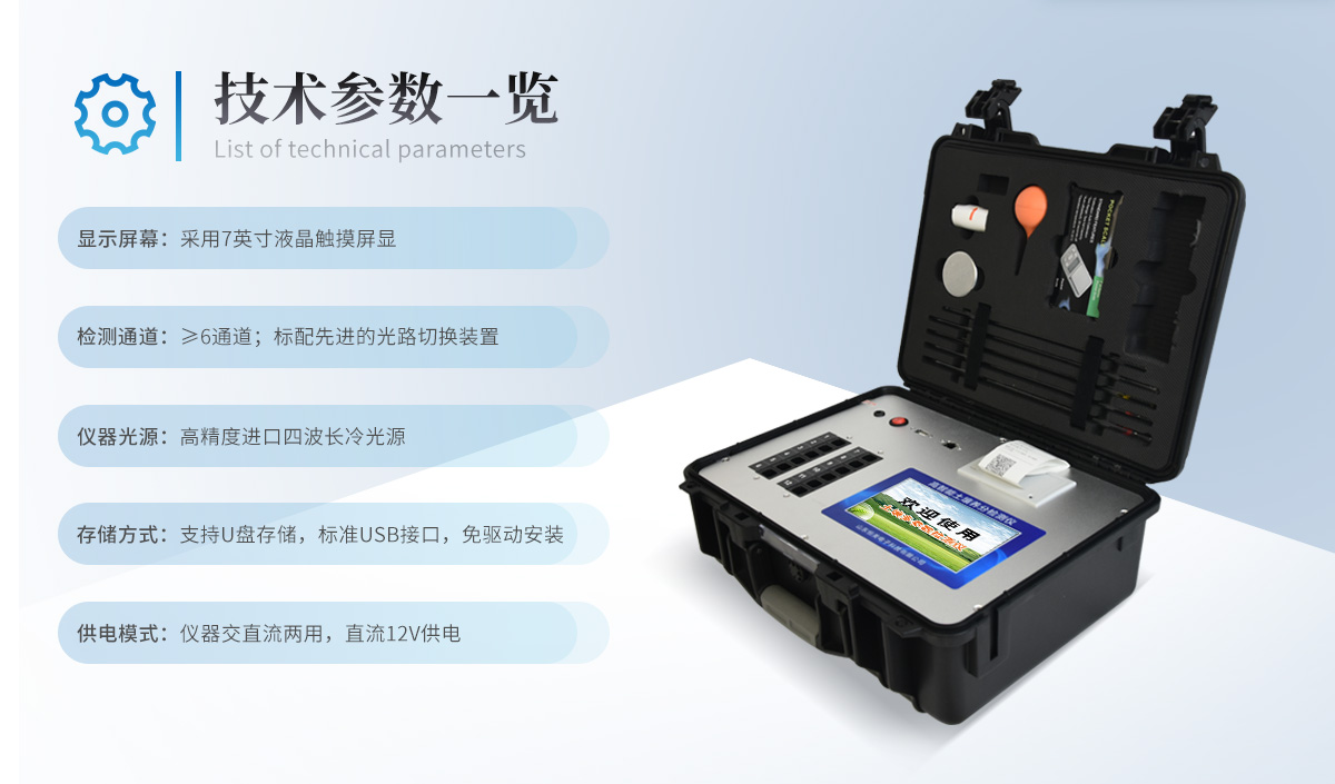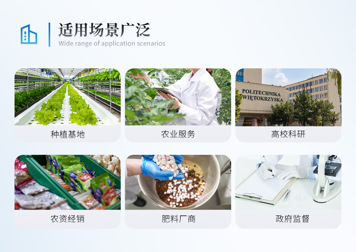 配套齊全:該儀器集藥、器、儀為一體,攜帶方便,相當于一個小型移動實驗室,無需用戶自配附件,亦可靈活野外流動測試。適于農業服務部門或農資經銷商、合作社、肥料廠商、大種植戶測土施肥。