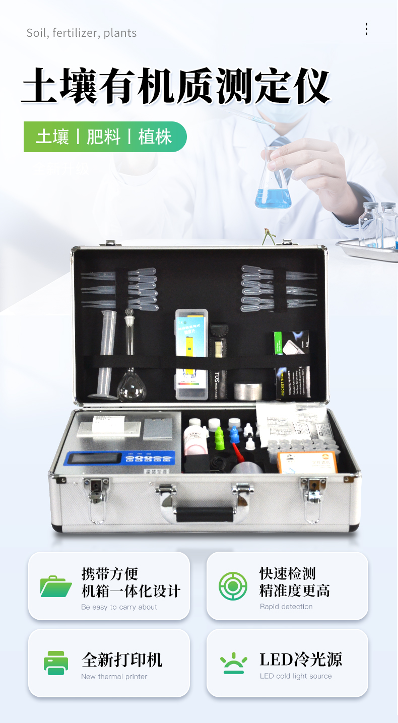 配套齊全:土壤有機質速測儀該儀器集藥、器、儀為一體,攜帶方便,相當于一個小型實驗室。適于農業服務部門或農資經銷商、肥料廠商測土施肥和鑒別肥料真假。