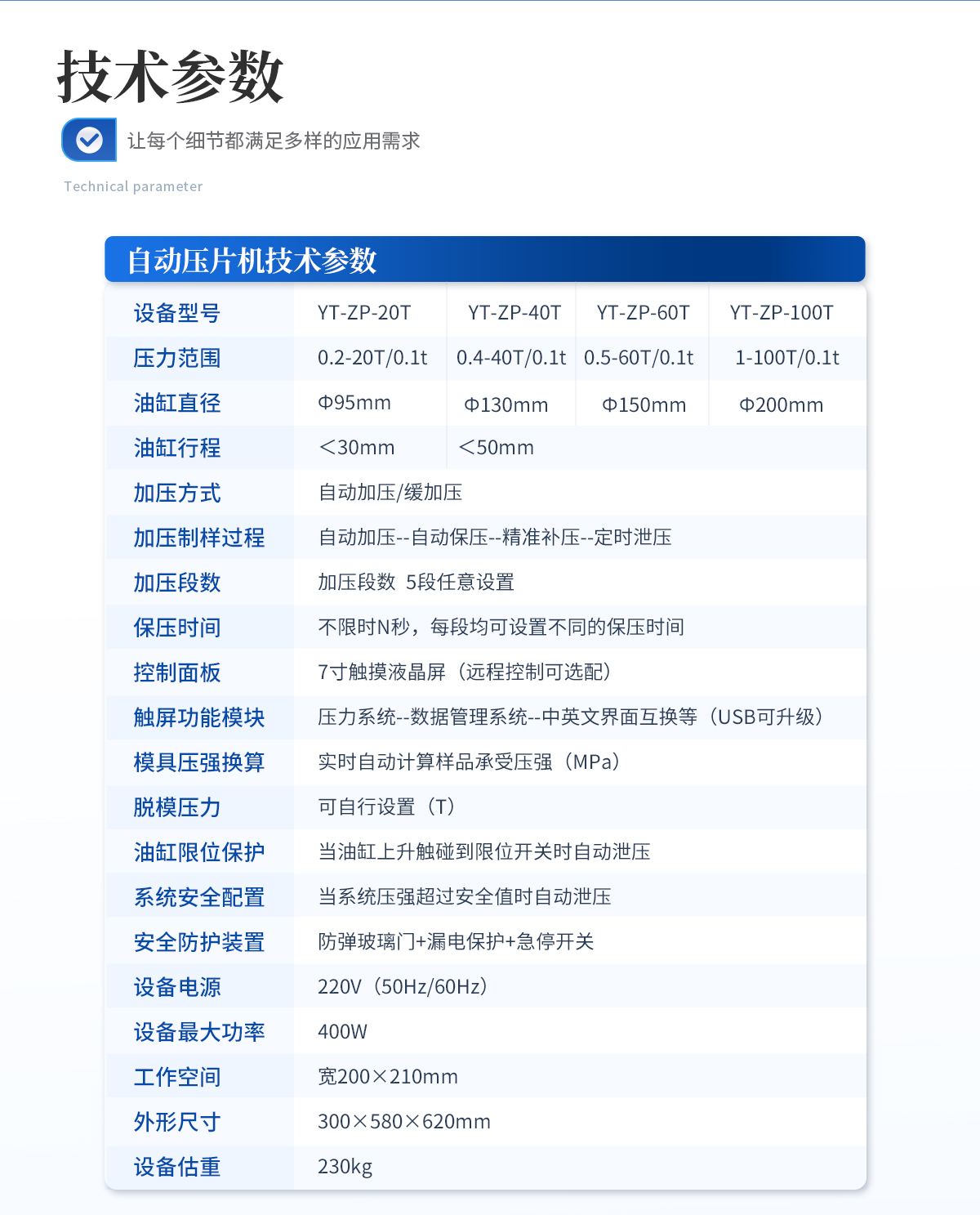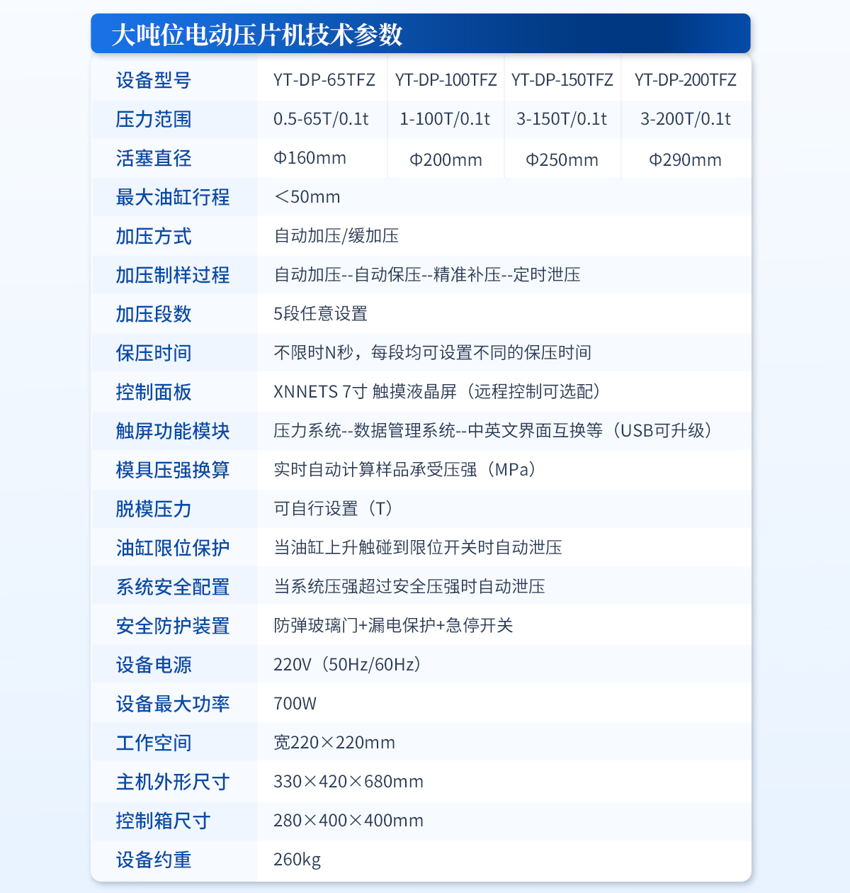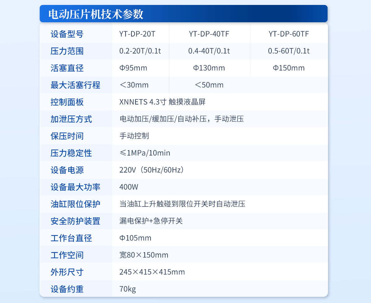 | 設備型號:YT-DP-40TF | 壓力范圍:0.4-40T/0.1t | 活塞直徑:Φ150mm | **活塞行程:<50mm | 控制面板:XNNETS 4.3寸 觸摸液晶屏 | 加泄壓方式:電動加壓/緩加壓/自動補壓,手動泄壓 | 保壓時間:手動控制 | 壓力穩定性:≤1MPa/10min | 設備電源:220V(50Hz/60Hz) | 設備**功率:400W | 油缸限位保護:當油缸上升觸碰到限位開關時自動泄壓 | 安全防護裝置:防彈玻璃門+漏電保護+急停開關 | 工作臺直徑:Ф140mm | 工作空間 寬145×185mm | 外形尺寸:295×450×500mm | 設備約重:110kg | 配置說明:壓片機1臺,模具選配!可根據需求定制壓片機或模具 |
