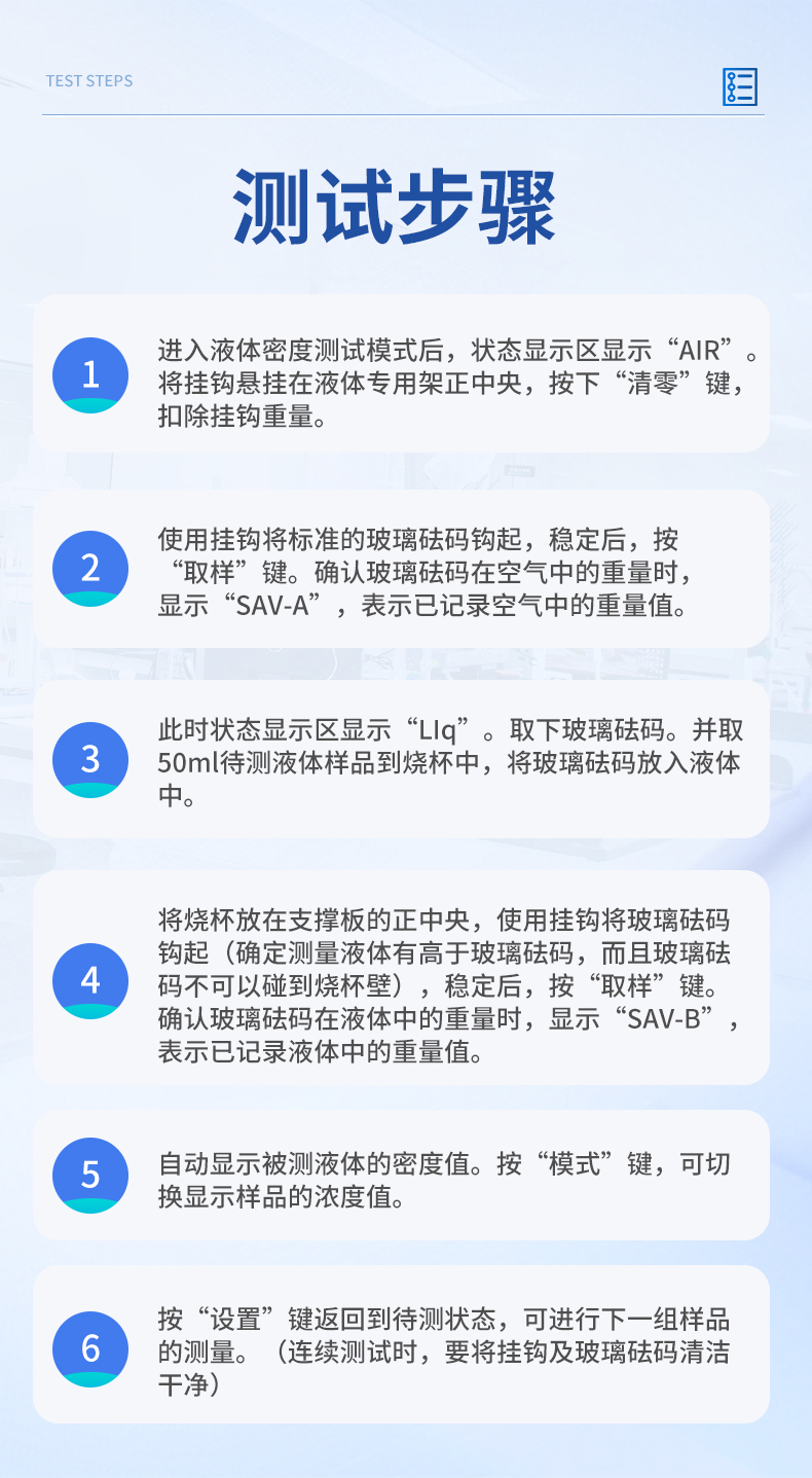| 1、進入液體密度測試模式后,狀態顯示區顯示“AIR”。 將掛鉤懸掛在液體專用架正中央,按下“清零”鍵,扣除掛鉤重量。 | 2、使用掛鉤將標準的玻璃砝碼鉤起,穩定后,按“取樣”鍵。確認玻璃砝碼在空氣中的重量時,顯示“SAV-A”,表示已記錄空氣中的重量值。 | 3、此時狀態顯示區顯示“LIq”。取下玻璃砝碼。并取50ml待測液體樣品到燒杯中,將玻璃砝碼放入液體中。 | 4、將燒杯放在支撐板的正中央,使用掛鉤將玻璃砝碼鉤起(確定測量液體有高于玻璃砝碼,而且玻璃砝碼不可以碰到燒杯壁),穩定后,按“取樣”鍵。確認玻璃砝碼在液體中的重量時,顯示“SAV-B”,表示已記錄液體中的重量值。 | 5、自動顯示被測液體的密度值。按“模式”鍵,可切換顯示樣品的濃度值。 | 7、按“設置”鍵返回到待測狀態,可進行下一組樣品的測量。(連續測試時,要將掛鉤及玻璃砝碼清潔干凈) | 儀器尺寸:195*220*190mm | 包裝尺寸:430*200*360mm | 包裝重量:4kg | 測試時間:約5秒 顯示值: 密度、體積 溫度補償: 溶液溫度可設定至0~100℃ 溶液補償: 溶液可設定至19.999 |